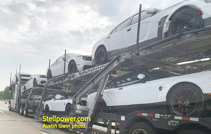 Austin Gwin was puzzled by this loaded car carrier heading from Canada to the Detroit area on I-75. As you can see, it has Chargers and Challengers protected by white wrapping—in at least one case, with a hole cut through it for the Hellcat logo to peek out.